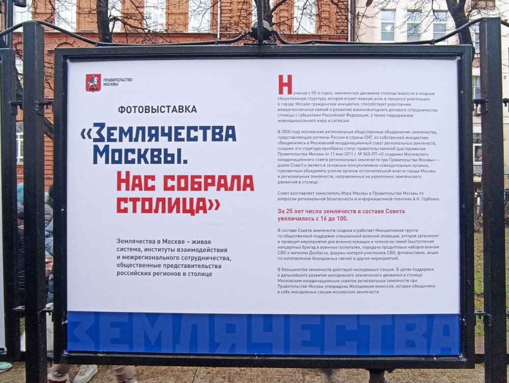 27 ноября в Москве состоялось торжественное открытие фотовыставки, посвящённой 25-летию Московского координационного совета региональных землячеств при Правительстве Москвы. Экспозиция разместилась на Никитском бульваре и стала масштабным проектом города Москвы.